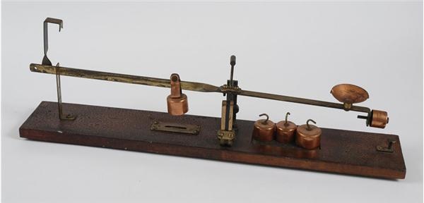 Early and vintage 1920’s golf club scale exhibiting an industrial aesthetic with its wood base, steel construction, and copper and lead weights, presenting its pragmatism with an air of elegance. 27” long at the base and 8” tall at the highest point, with working bubble level and smooth slide weight. That its lacquered wood surface has beaded with age, adds just the right amount of textured charm. In working order, its bubble is marked Paul Potter, Baldwin, L.I., and the end weight has the Arco Pat. # on it. It all comes together as a remarkable piece of utilitarian art.
