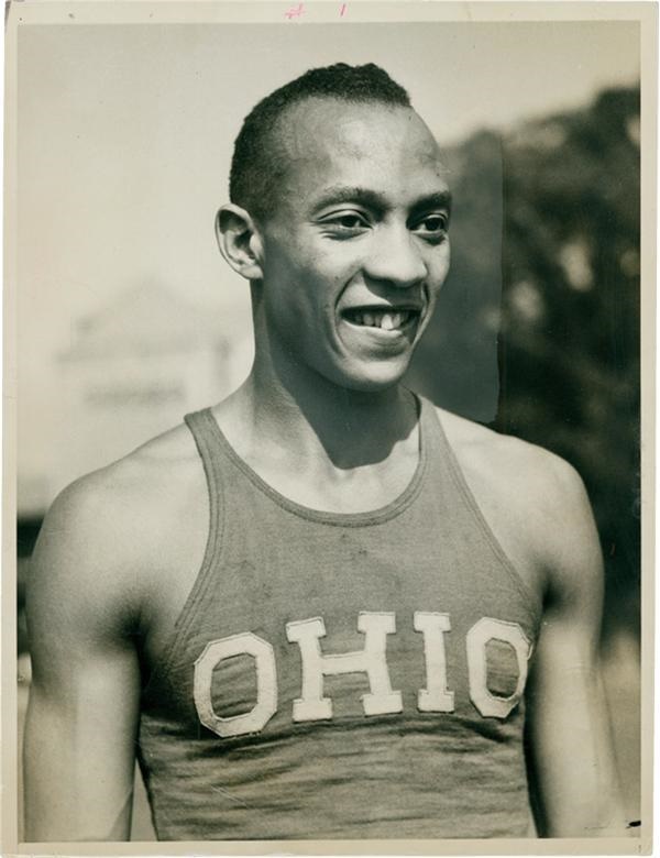 Early image of the famed Olympian and one of the greatest athletes of all time. Taken while he was still at Ohio State University, during the same year in which during a span of 45 minutes on May 25, 1935 at the Big Ten Conference meet in Ann Arbor, Michigan, he tied the record for the 100 yard dash and set world records in the long jump, 220 yard dash, and the 220 yard low hurdles. An incredible feat that is widely considered one of the most amazing athletic achievements of all time. On the back is the original copy, dated 12/18/35, along with "Acme Newspictures Inc." stamping. Minor pinholes, and pen markings, EX.
