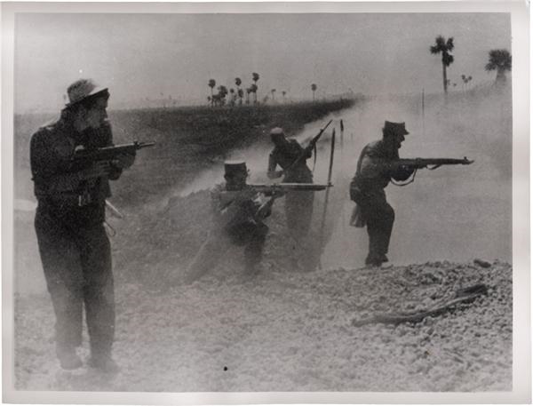This ill fated invasion is shown in these two images of the pro-Castro forces that shot down the U.S. backed incursion of 1,500.  The model of the first chapter of the JFK presidency, he would be hamstringed by his own military.  Original paper caption on one (1963) and the other date stamped 1961.  EX-MT.  Both nearly 8x10”.