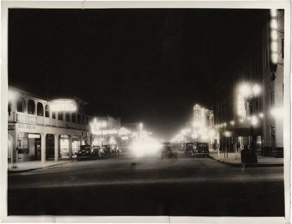 Amazing image of earliest Vegas at night. Downtown Vegas before it was replaced by the strip as we know it. It still boasted 17 gambling joints and 64 bars. Original paper caption. International News stamp on verso. EX-MT. 7x9".
