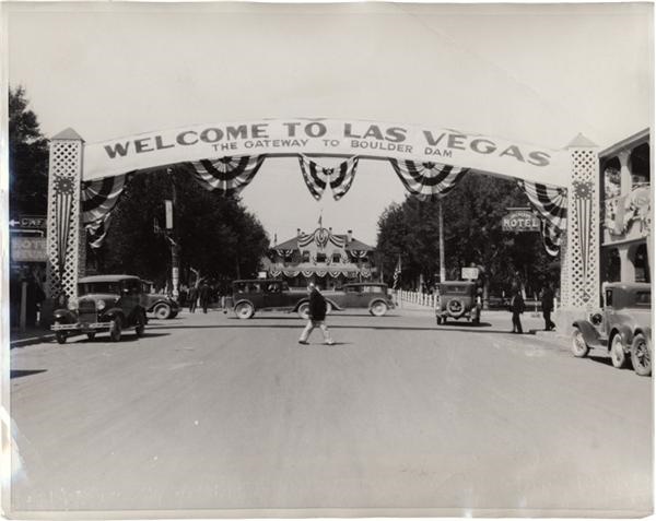 Main Street in Las Vegas when it first came alive as a result of the Boulder Dam, which first started construction that very year. The banner hanging above makes that abundantly clear. Original paper caption. International Newsreel stamp on verso. Corner crease o/w EX+. 8x10".