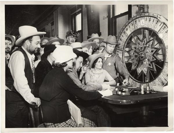 Only the second one ever in what would become a major event in Sin City. Two great images of the patrons dressed in Wild West clothing to the nines. One is of the craps table, the other of the big wheel. Original paper captions. International News stamps on verso. Overall EX-MT and 7x9".