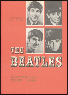 This 36-page Australian Tour Book features a great Parlophone ad with a complete 45, ep, and lp discography. Several other Beatles ads, too. Beginning on the 12th, the group performed 12 shows over 9 days before heading to new Zealand. An additional four shows were given after the New Zealand gigs. Ringo, sidelined with illness since the 3rd, returned to his drumming duties on the 15th, having been replaced by Jimmy Nicol for five shows in Denmark, Holland, and Hong Kong. 8x11" NRMT.
