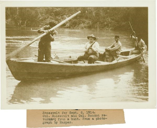 Teddy Roosevelt took his last great trip of exploration and adventure in 1914, visiting a remote and largely unmapped portion of the Brazilian rainforest. Candice Millard’s book on the subject, entitled “The River of Doubt”, was published in 2005 to general acclaim. From the first, the expedition courted disaster, and lives were lost; Roosevelt was, in fact, fortunate to return alive. This outstanding collection of 31 period photographs, some attributed to Roosevelt’s son Kermit, provide an extraordinary “eye witness” account of the trip. The majority of photos are 8” x 5 1/2”, and are in overall EX condition. Some are fully captioned, but about half are missing all or part of their captions, due to deterioration of paper on which the captions were printed.