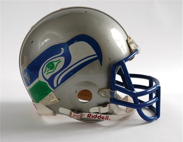 Before patrolling the sidelines as coach, the towering 6'7" Tice terrorized opposing defenses with his incredible size and strength for fifteen NFL seasons. Offered is the Seahawks helmet he donned at the beginning of that run during his first years in Seattle. The Riddell helmet shows significant use with a number of scratches to the outer shell and noticeable toning from sweat on the inner padding. Inside is "TICE" on a custom name label and [size] "7 3/4" label.