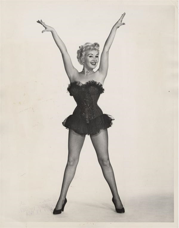 Betty Grable was one of the most successful singing actresses during the 1940's. She was the epitome of the all-American girl, apple pie, girl-next-door and she was loved by millions around the world, men and women alike. During World War II her legendary "one over the shoulder" pin up photo graced foot lockers and barracks to over 1,500,000 GI's who were inspired by Betty's million dollar legs. Thirty movie stills, studio promos, and wire photos span three decades of her unforgettable career (40's-60's) and include highlights such as her at The Stork Club, with Mario Lanza, with Victor Mature, appearing in "Coney Island" (1943), and during her and Harry James' divorce hearing. Overall EX-EX+ photos range in size from 7x9"to 8x10" with most wire photos having original paper or front captions.
