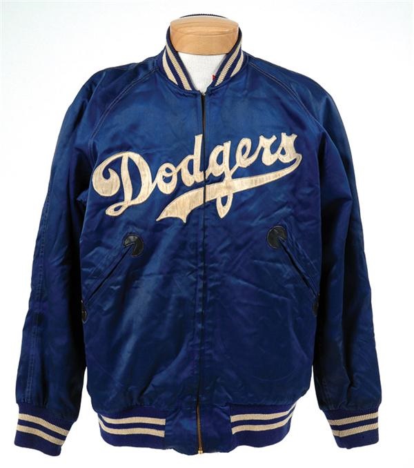 Offered is a rare Brooklyn Dodgers jacket (circa 1947) owned and worn sparsely by Burt Shotton during his time as manager of players like Robinson, Snider, and Reese. Just as his stylish and business-like predecessors, such as Connie Mack did, Shotton could often be seen before, and at times during, the game in more formal attire making this garment a rare find indeed. The blue satin outer shell has "Dodgers" sewn across the front and a grey fleece inner lining. The pocket ends are trimmed in black leather. Made by Wilson with appropriate tagging in the collar and chain-stitched with "Shotton" on the jacket's inner facing above the hem. The tab on the zipper has come off but is contained in the one pocket. Nice use but fine condition. Ex Barry Halper Collection with auction tag still attached.
