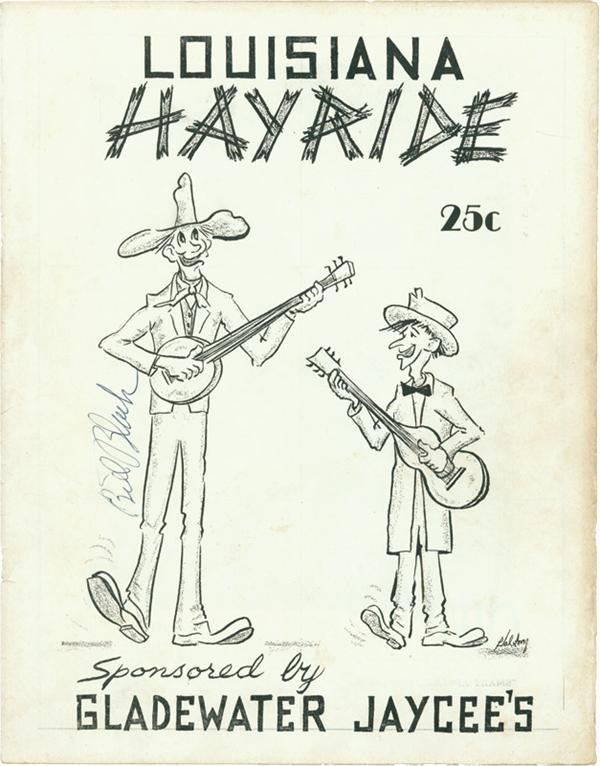 Phenomenal, early signature specimen penned by the 19-year-old Elvis while still a member of the famous KWKW "Louisiana Hayride" show in Shreveport. Written on his feature photo page inside this LH program is, "Love Ya-Elvis Presley", in strong blue ballpoint that grades "9" out of "10", based on the autograph alone. The inscription does display a few minor breaks but still remains a 7/10. Signed by three other artists in attendance that evening: Bill Black, Frank Page, and Johnny Horton in the same ink which collectively grades as 8/10. The five page program itself is VG. LOA from JSA.
