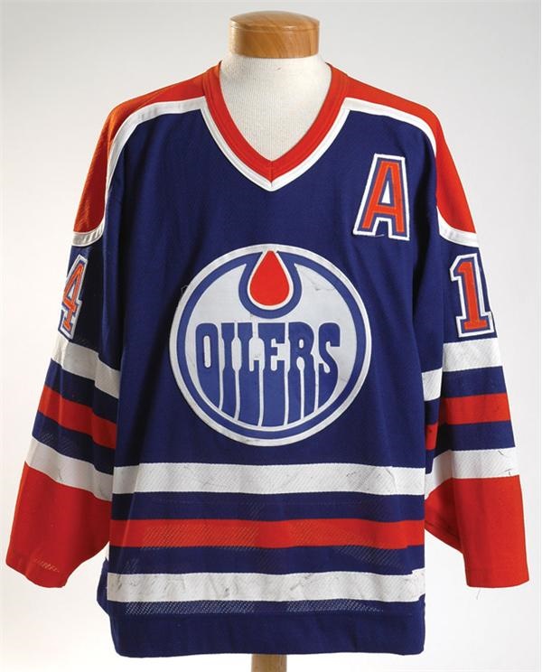 Although he won three championships in Edmonton, Craig is best remembered for taking the last faceoff for the New York Rangers in Game Seven of the 1994 Stanley Cup Finals, with 1.6 seconds remaining, to give them the win and break the Rangers’ 54-year Stanley Cup curse. Offered is his blue Air-Knit “road” jersey made by CCM. On the front is the “Oilers” crest and assistant captain’s “A”, while his number “14” fills both sleeves and back. “MacTavish” is sewn in white tackle twill to a matching name plate that rests across the shoulders. The manufacturer’s tag in the collar has [size] “52” written on in pen, with additional “90/91” and “Z” penned in just above. The jersey displays outstanding overall use with stick marks and team repairs on both sleeves. All original with LOA.