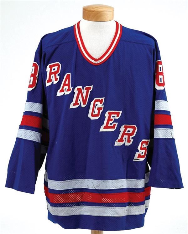 Radiating in vibrant blue, with red and white stripes, this New York Rangers aged and battle-worn 1989-90 jersey is alive with stick marks, tightly stitched team repairs, and some pilling inside. Worn by center Darren Turcotte when the Rangers were consistently showing up in the playoffs, as in this season’s end when they lost to the Washington Capitals in the Patrick Division finals. Jersey sports “Rangers” diagonally on the front, and Turcotte’s # “8” on both sleeves and the back. “Turcotte” is sewn directly on the back above his number, and has Cosby and CCM tags in the collar.