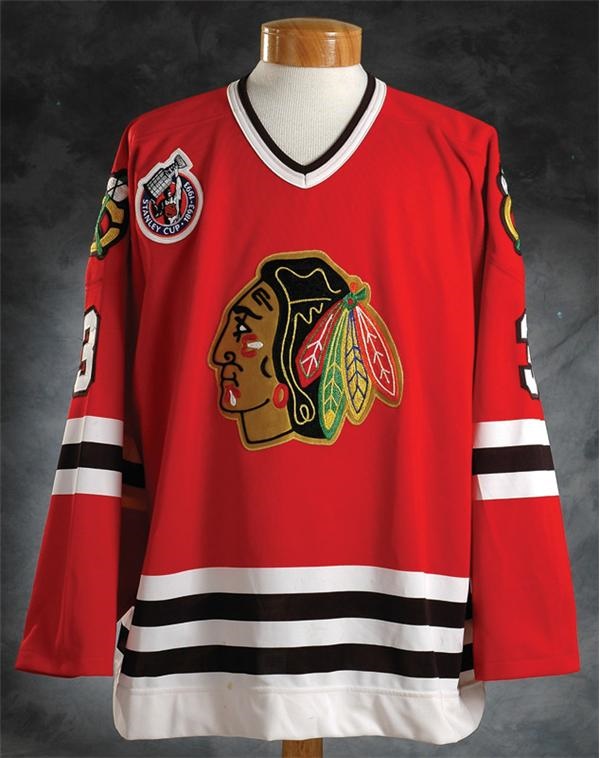 Craig Muni was patrolling the blue line for Edmonton when they took home 3 Stanley Cups in the late 80's. This jersey is from his short tour of duty with Chicago, where he was traded from Edmonton for the last nine games of the season. Blackhawks jersey has a "Maska Ultrafil" and a size "54" tag in the collar. Hawks crest on front with Stanley Cup Anniversary patch on right breast. Patches on both sleeves with "3" . "Muni" sewn on plate on back above number "3". Very light use.