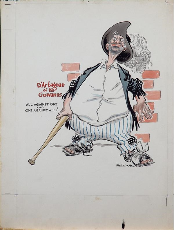 From the mid-1950's, a unique and utterly amazing hand-colored pen and ink drawing by the widely celebrated Willard Mullin, considered the Dean of American sports cartoonists. Mullin is generally credited with originating the "Brooklyn Bum" character, and this version is surely among his best - in fact, the illustration was used on the cover of a Dodger banquet program. The famous Brooklyn Bum clenches a baseball bat, and "D' Artagnan of the Gowanus - All Against One and One Against All!" appears to his left. The famous "Willard Mullin" signature appears at lower right, and is itself considered a work of art, always comprised of exactly 26 vertical slashes of the artist's pen. This absolute masterpiece measures 15" x 20", and is supremely executed on artists board with pen, ink and watercolor. As a real bonus, part of an abandoned larger work by Mullin, in ink over pencil sketching, appears on the reverse of the board. Artwork is NRMT, while backing board is EX. A great one that will surely become a centerpiece in any collection!