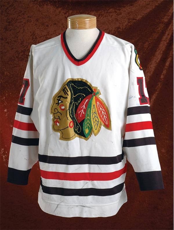 An extraordinarily rare game used garment dating from the gritty defenseman’s earliest days in Chicago. In 1985, the promising youngster, then considered an offensive weapon, hit the proverbial rookie wall and was sent back down before reemerging in the NHL as a third line demon the next season. For that reason only a handful of jerseys from that year exist and by the looks of this battered specimen there may have been even fewer than that. Wayne’s white “home” sweater is sewn with the team’s logo on front and Chicago’s “C” logo on the shoulders. The back and sleeves both are adorned with his number “17”, while across the shoulders, sewn to a white nameplate, is “Presley” in black tackle twill. Stick marks, scuffs, and team repairs can be found in large quantities throughout the front and back with a concentration of the use seen around the hem/chest areas. Made by CCM with Maska tagging in the collar and embroidered with “Gunzo’s” and “CCM” logos on the tail of the reverse. Simply fantastic!