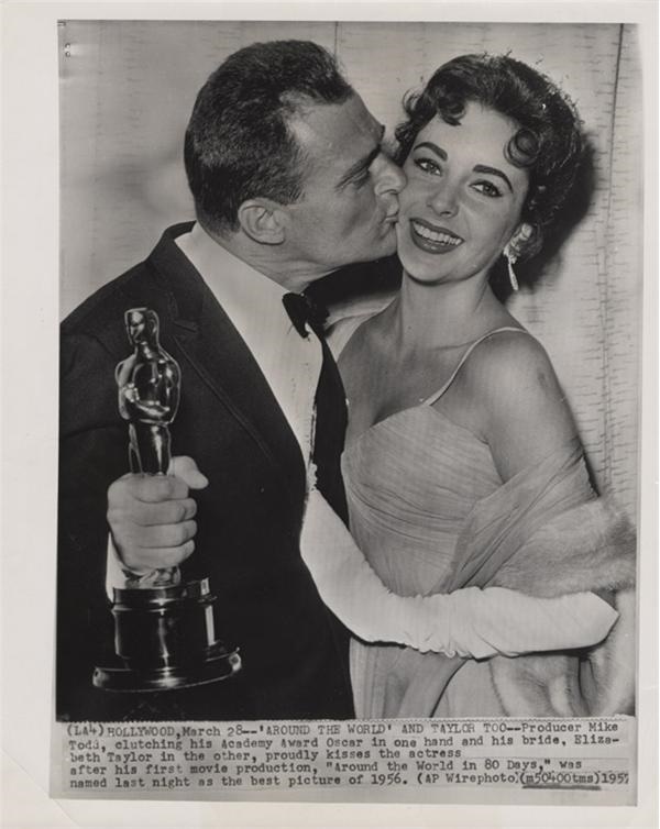 Producer Mike Todd gets the prize. At least the Oscar is permanent. He receives the Academy Award for Best Picture for 1956 for "Around the World in 80 Days". It was his first production, and he kisses his bride Liz Taylor in exultation. Front caption. EX+. 8x10".