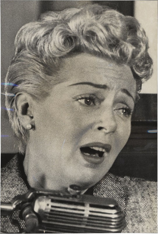Amazing first generation image of actress Lana Turner at the coroner’s inquest in the killing of mobster Johnny Stompanato. Turner is doing her best acting job (or is she?) in explaining that when her daughter Cheryl Crane stabbed him, he had seconds before threatened to kill Turner. Original newspaper article affixed to the verso. EX-MT. 7x9".