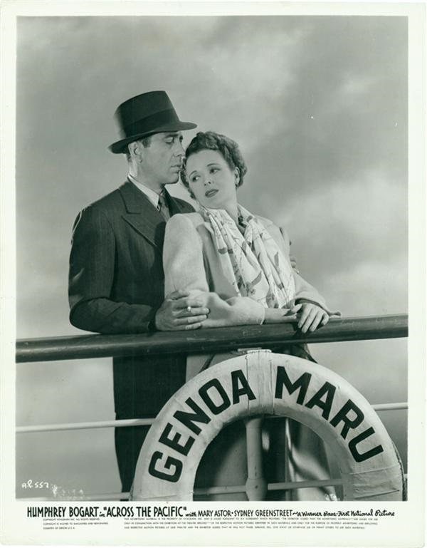 This pair meets again after their brilliant connection in "The Maltese Falcon". Original still from "Across the Pacific" stars Bogart and the woman in red Mary Astor whose sex scandal rocked the world. EX+. 8x10”.