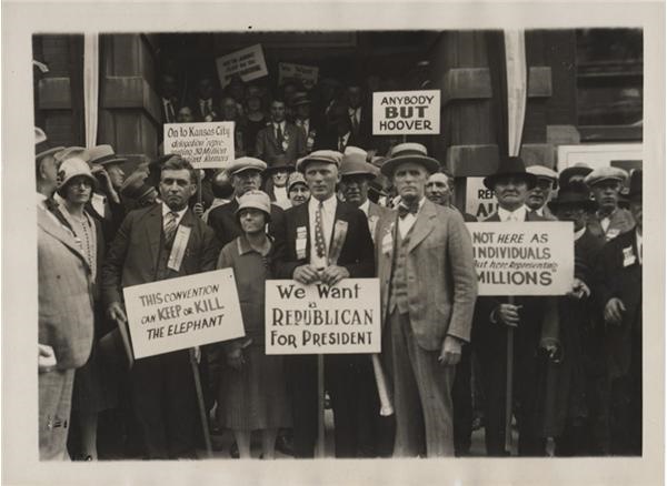 Anti Herbert Hoover supplicants gather at the 1928 Republican National Convention in Kansas City. Gorgeous image and equally powerful signage. NRMT. 6x8”.
