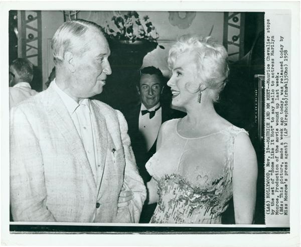 Maurice Chevalier visits her on the set of the film where she established the high water mark for a difficult actress. Said Tony Curtis in kissing her on screen, it was like kissing "Adolph Hitler". Front caption. EX+. 8x10".