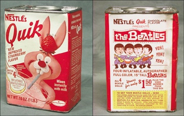 Nestles makes the very best…Beatles memorabilia on their container. As mentioned on the front panel, special offer features four inflatable Beatles dolls. See back panel. Clean overall with some aging and creasing of old container. Oh, I forgot to mention, it comes in chocolate or strawberry with the latter (this one) being the scarcest.