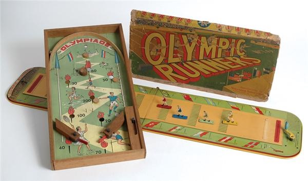 Primitive and evocatively charming, these two Olympic-themed (1928 Amsterdam and 1932 Los Angeles) games sweetly incorporate the spirit and wide-ranging athleticism of the Games. 1) 1928 "Olypiade" pin ball-type game is wood construction, with color lithoed playing field. Comes with steel ball, and is EX. 2) 1932 "Olympic Runners" by Wolverine is a tin litho, mechanical-type running race game, with runners fueled by vibrations generated by a dial wound by player. The game comes complete with box, and is itself EX+, while box is flattened and G.