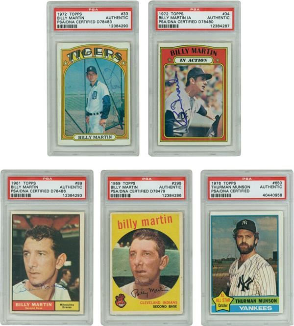 Thurman Munson’s autographed 1976 Topps card highlights this group of five signed cardboard specimens that also includes four examples from fellow Yankee, Billy Martin. His black felt tip signature grades a “6” out of possible “10” and rests on an EX canvas. Martin’s ink includes: 1) 1959 Topps (VG) signed in blue ballpoint (7/10). 2) 1961 Topps (EX) signed in blue ballpoint (8/10). 3) 1972 Topps In Action (EX) signed in blue felt tip (8/10). 4) 1972 Topps (VG) signed in blue ballpoint (7/10).