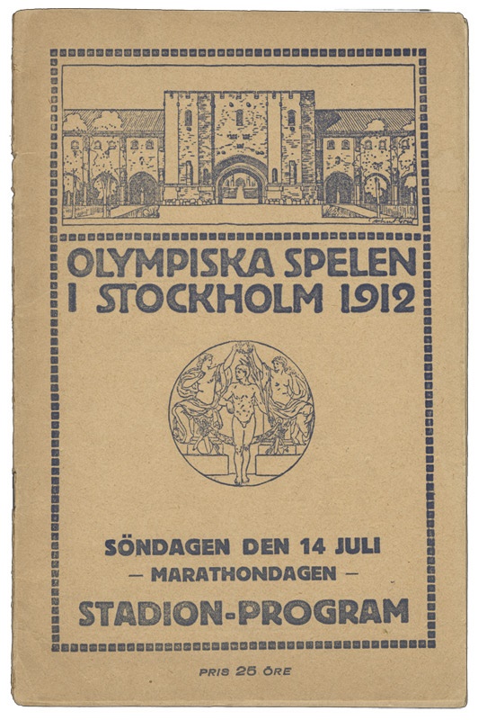 Very rare official program from July 14, 1912, as Stockholm played host to the Olympics and it was known as the "Swedish Masterpiece" because of how well it was put together and run. Jim Thorpe is listed on page 12. Condition is nice with only problem being a semi-loose spine and a few loose pages. Some pencil writing inside. VG.