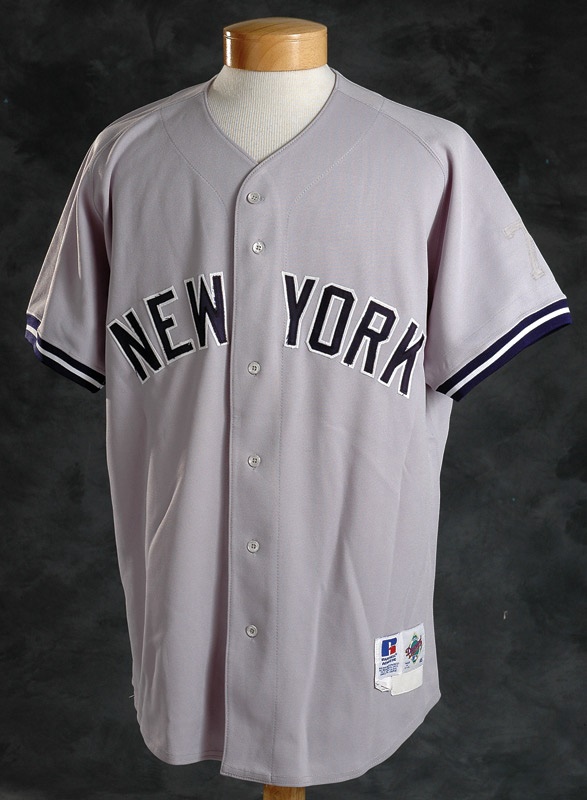 New York Yankee outfielder Bernie Williams knows that good things comes to those who wait, after signing with the Yankees in 1985, it wasn’t until 1993, after several years in the Minors, that Williams got to prove himself, and 1995, the year this tan road jersey was fastened up, was a stellar one for him, leading his team in runs, hits, total bases and stolen bases, not to mention his 18 home runs that season. After losing to the Mariners in the American League Division Series, Williams and his Yankees would return in 96 for a World Series title (and three consecutive titles for ’98, ’99 and 2000) and the beginning of new pin-striped dynasty. Road jersey has "New York" on the front and "51" on the back. Russell tag in front tail (size 46), along with 100% Polyester and 1" Extra Length flag tags. "B. Williams 95" also on tag in front tail, though this shirt is so hammered with use that the name and year are barely visible in on the tag. Heavy use. Mickey Mantle #7 and black armband has been removed from the left sleeve, where it once rested in remembrance of the Yankee great who died that year.