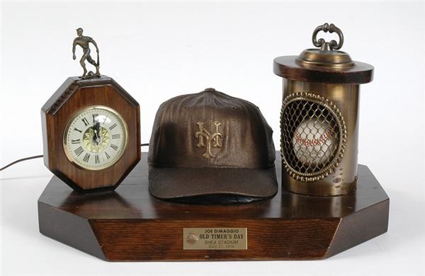 Joe DiMaggio attended the 1976 Old Timers Day at Shea Stadium, and was presented with this unique award. Mounted on a 18" x 14" x 11 1/2"H 8-sided solid wood base are a Mets baseball cap in textured bronze, an official National League baseball with Charles S. Feeney faux signature, within a cylindrical display with interior lighting, and a clock set in a wooden stand topped by a small figure of a ballplayer in bronzed metal. A small brass plaque commemorates the event, and is inscribed "Joe DiMaggio / Old Timer's Day / Shea Stadium / July 17, 1976". The award has well-established provenance, and was originally part of the DiMaggio estate. The metal figure atop the clock has been repaired where it meets its base, but condition otherwise is EX-MT.