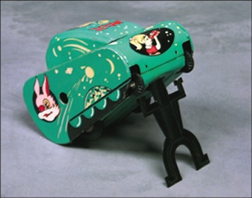 Tin made in China wind-up toy. Television take-off with Judy look-alike on top. Has turn-over action. NRMT.
