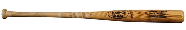 Baltimore Oriole first baseman Eddie Murray gripped this Louisville Slugger gamer during the height of his career - the few years before and just after his team won the 1983 World Series, when he was perennially voted in the top five for MVP - circa 1984-85, during which he reached career season high marks with 124 RBI’s and 37 doubles, as well as a 22-game hitting streak in 1984. Model M272 has Murray's signature burned into barrel, where below he signs an 8/10. " #33" on knob in orange. Handle with tape residue is cracked, as well is the barrel, with moderate use. Measures 35+”.