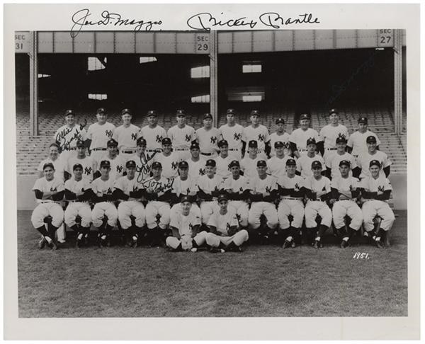 '51 marked the most significant passing of "the torch" in Yankees franchise history. During Joe D's final season in pinstripes he tutored along a bright eyed rookie by the name of Mantle who, few outside the organization knew, would usher in a new era of greatness. Together their signatures rest along the white border by of this fantastic team photo along with those of: Reynolds, Coleman, Henrich, and DiMaggio again. The vintage signatures can be dated to the 1960's and are 9-10/10. LOA.