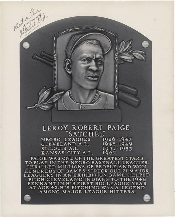 Satchel's HOF plaque captured in this vintage photo was produced by the National Baseball Hall of Fame and comes with their stamp on the reverse side. Signed in the upper left white border "Best Wishes From Satchel Paige." Black ballpoint signature is 8/10. Comes with LOA.