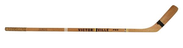 If this Victoriaville Pro isn’t one hockey’s “Holy Grail” sticks we don’t know what is. Game used by #4 in his second Hart Trophy season. His record breaking numbers that year were off the charts for a defenseman, 37 goals and 102 assists for 139 points. End to end rushes game after game. This stick for sure had some of those points on its blade. It is a work of art in wood with the Bobby Orr patented thin tape job to keep those slap shots a few inches off the ice. All original tape on the top of the shaft, adorned with a vintage Orr signature in black ballpoint. Serial # 591454, this stick was given to a St. Louis Blues staffer after a game.