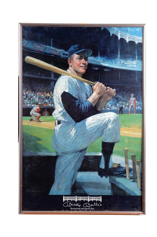 A great-assorted group of Mickey Mantle flats including a large framed 24" x 36" poster advertising Mickey Mantle's Restaurant in New York City. There is a 31" x 21 1/4" framed poster of Mick's plaque out in Monument Park. The last framed piece is a group of small black and white photos featuring a young Mantle in uniform and in street clothes. There is also an original 1950's photo of Joe Di Maggio handsomely dressed in a dark suit. The remaining pieces in the collection are assorted pieces of advertising mostly from the early 1950's, included are ads for Camel Cigarettes, Kodak film, Sports Illustrated, Rawlings Baseball equipment, Haggar Slacks, among others. Also included are a few vintage articles from the Saturday Evening Post and a June 15, 1953 Time Magazine Cover. A great lot sure to bring back several memories to a life long Mantle fan.