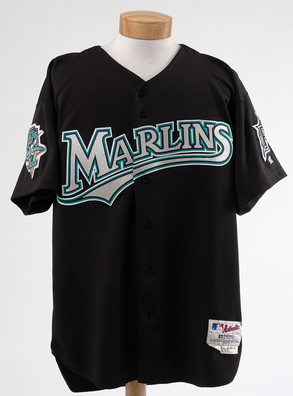 Talk about your first seasons, hurler Dontrelle Willis proved to be a pitcher with panache, earning his N.L. Rookie of the Year as he went 14-6 with the Florida Marlins in 2003 on the way to their second World Series title. Game-worn black Marlins jersey was made by Russell Athletic, and is a size 52. All proper tagging, with "35-WILLIS" on swatch underneath manufacturer's tag. Marlins 10th Anniversary patch on the right sleeve. This jersey from his first season shows very good wear overall.