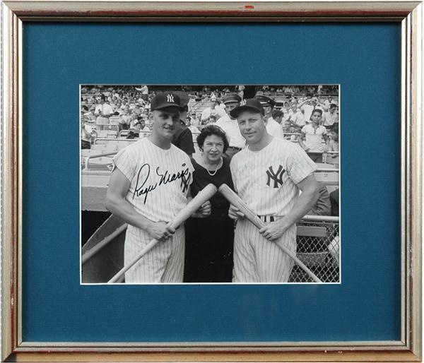 Wonderful, original photo featuring three of the biggest names in batting and the history of baseball for that matter. Taken during the 1961 World Series in New York, Mantle, Maris, and Ruth (Claire Ruth that is!) are shown standing side to side inside the house that the Babe built. Both The Raj and Mick have signed, but unfortunately, while Maris' Mint example is a striking, the blue ink autograph from Mantle has nearly faded away completely. The photo is in Excellent condition, matted and framed to 11x13".