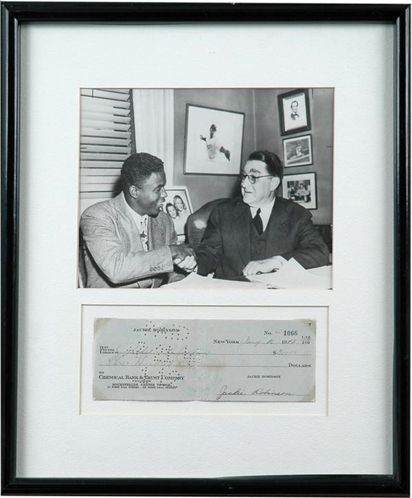 Large format (3x8") checks from this HOF legend are rarely seen, nor are checks dating from his playing days. This wonderful specimen, dated July 16, 1948, during only his second season with the Dodgers, was written by his wife Rachel for the amount of $300.00 to her. Signed by Jackie in black fountain pen that grades 7.5/10 on a check that is EX, with center fold and bank markings. Matted and framed along with an 8x10" photo of Robinson with Branch Rickey (NRMT). Total measurement is 15x18".