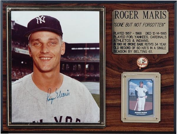 Beautiful satin finished photo of the smiling Home Run King in his Yankees road jersey was neatly signed by Mister 61 in blue sharpie. The autograph's fluidity and strength in color allow it to be graded an "8" out of possible "10" and the original 8x10" image is Near Mint. Nicely arranged on a dark wooden plaque along with "Gone But Not Forgotten" engraved plate and player card. Overall measurement of 12x16".