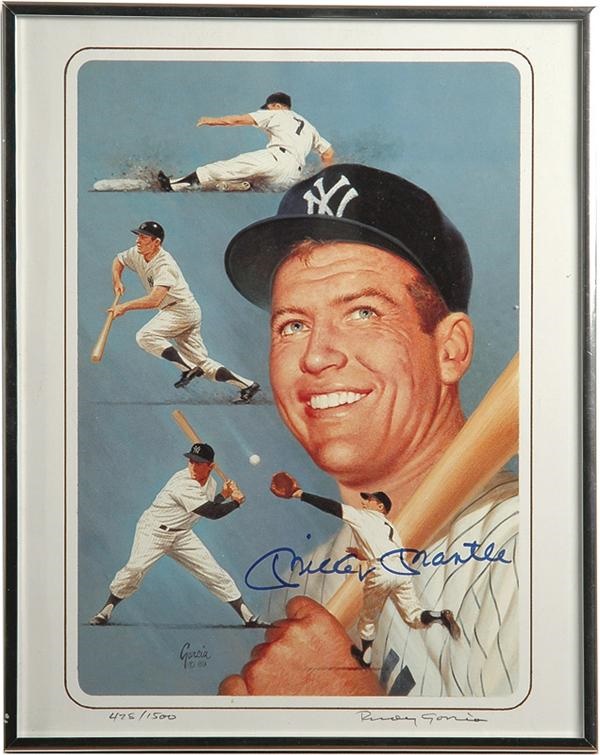 A nice lot, this quintet of Mickey Mantle autographs, marked on an interesting variation of images of The Commerce Comet. 1) Terrific 7 x 10" color photo of a veteran Mick on deck, with a killer sharpie signature, and on wood plaque. 2) Classic 8 x 10" pose in pinstripes, with 8 of 10 sharpie signature, and on wood plaque. 3) 11 x 14" color illustration by Garcia from 1989, print #428/1500, with a beautiful blue sharpie autograph (10/10), and MINT in its silver frame. 4) 11 x 14" color photo of the Mick posed with bat, with a 7/10 sharpie signature, and VG-EX on wood plaque. 5) “M&M Boys” signed cachet from 1986, with fantastic signature, and Mint on wood plaque.