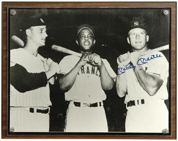 Another solid collection of Mickey Mantle autographs, this time on four black and white photographs, nicely mounted on wood plaques and protected by a clear plastic covering. 1) Sweet early 8 x 10" pose of Mickey in road duds, signed in blue (9/10), and in MINT condition. 2) A photo of Mantle swinging and looking towards the sky is titled "The Home Run Swing,” and measures 8 x 10", with thin blue Sharpie signature (9.5/10). NRMT. 3) Early 1960's 11 x 14" of Maris, Mays and Mantle, autographed by Mickey only (10/10). NRMT. 4) 11 x 14" with Stan Musial, signed "Hi Stan, Mickey Mantle" (10/10). NRMT.