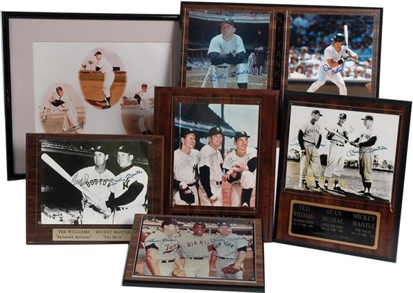 Group of six photos autographed by Mickey Mantle and other Hall of Famers. Includes 11 x 14" composite photo of Mantle, Mays and Snider, signed by each in blue. Sigs 7.5-8.5 of 10, with Mantle's being the strongest. Near Mint. Matted and framed; 8 x 10" of Killebrew, Mays and The Mick at the 1968 All-Star Game. Signed by each in blue. Mantle (8/10), Mays (7/10), Killebrew (9/10). Mint condition photo on wood plaque. 8 x 10" of Mantle, Williams and Musial, signed by the trio in blue. Mickey's autograph is the best here (8/10), with the other two having lightened somewhat. Excellent, on wood plaque; 8 x 10" of Mantle, Ford and Martin, with blue Sharpie autographs that rate 6-7/10 overall. Excellent condition, on wooden plaque. 8 x 10" black and white image of Mickey with Ted Williams, signed by both in Sharpie. Mantle's auto is a 9/10, with Ted's having lightened a bit (7/10). On wood plaque. Last one is two 8 x 10's together on a plaque, Mantle and Mattingly. Both blue Sharpie signatures are perfect 10s!!! NM-MT.