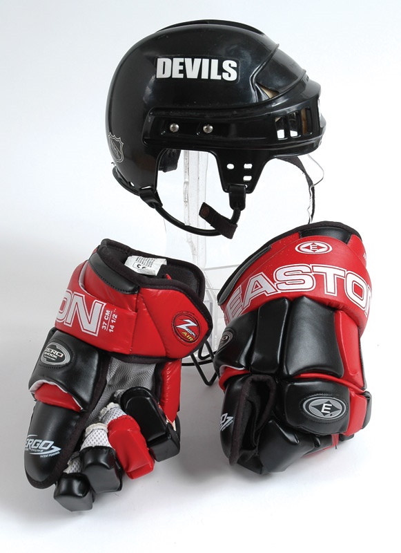 In 2000, Jason Arnott broke a 1-1 tie in double overtime of game six to give his New Jersey Devils a Stanley Cup victory at the expense of the Dallas Stars. This is the helmet and gloves worn by Arnott when he brought the Cup to New Jersey. Helmet has "CCM" on the front and "Devils" on both sides. In the back, his number "25". The gloves read "Easton 37 CM 14 1/2" on the wrist. Just below that, "Arnott." "Easton" stamp on the back of the knuckles. On the thumbs, "Zero Shock Technology" and "Ergo Lock Thumb." Light use. LOA from Devils employee.