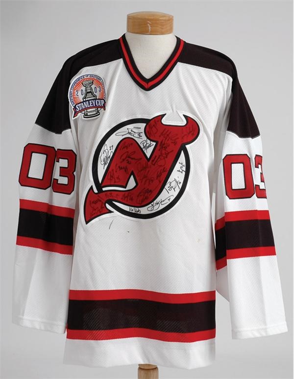 In the collar a "CCM" patch over a size "56" tag. On the right chest, the 2003 Stanley Cup patch. On both sleeves "03" is sewn on. 21Devils have penned their autographs, all in black marker, on the crest on the chest. Verso has "CCM" patch over "Murray" over an oversized "03". At the bottom of the tail is an "NHL" patch. Jersey is virtually spotless.