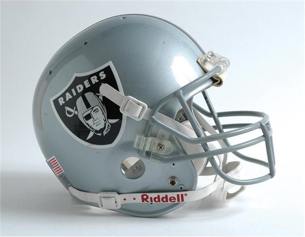 A long time fixture and face of the Raiders, Tim Brown, has become one of the most prolific receivers in NFL history during the course of his eighteen year career. Offered is the Riddell helmet donned by the savvy speedster during the 2001 season with its original facemask and chinstrap. Team logo decals are affixed to each side and his number "81" on the reverse along with the NFL shield and an American flag (worn in support of the Gulf War). Inside his "81" is written in marker once over each ear hole. Overall, the helmet shows nice use and was obtained through a team source.