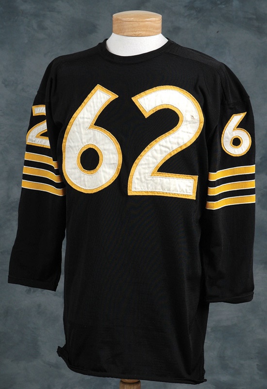 What would a pirate be without his gold? Offered is a game used jersey from the Raider's third pre-season, when the team's scheme included the favored color of swashbucklers from seas to sea, in addition to the familiar silver and black. On front, back, and sleeves is the sewn number "62" in double layer tackle twill and gold/white stripes accent the upper forearm area. Manufactured by King O'Shea, with their label in the tail, alongside [size] "48" and "Long" tags. Shows nice use overall. A very rare piece of early Raiders garb to add to your collection of vintage booty.