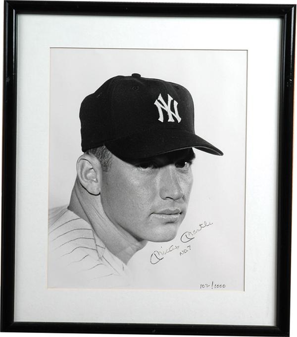 Quartet of larger photographs each signed by Mickey Mantle. 14 x 17" color shot of Mickey from the 1950's. Blue Sharpie autograph is an 8/10. 12 x 18" photo of The Mick at the plate with lightened signature (5/10). Another 12 x 18" color image of a grinning Mantle at third base has 7/10 Sharpie autograph. Final one is stunning black and white 14 x 17" facial shot, so clear you can see the pores in The Mick's cheeks. Numbered 102/1000 at the bottom, this gem has a 6/10 Sharpie signature. All are matted and framed with the exception of the first.