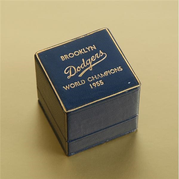 An unusual memento from the greatest year in Dodgers history, this rarely seen 1955 Brooklyn Dodgers World Series ring box measures 2 1/8" on each side. "Brooklyn / Dodgers / World Champions / 1955" is simply and very attractively lettered in gold on a blue background, with "Dodgers" appearing as the familiar underlined logo in script. Condition is EX-MT, with 95% of gold lettering fully intact. Inside is complete with cushion, awaiting the original ring.