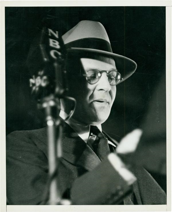 The gossip columnist was perhaps one of the most powerful men in America. This is a promo still for his feared and treacherous radio program brilliantly challenged in the fictional film "Sweet Smell of Success" (1957). Original paper caption. EX-MT. 7x9".