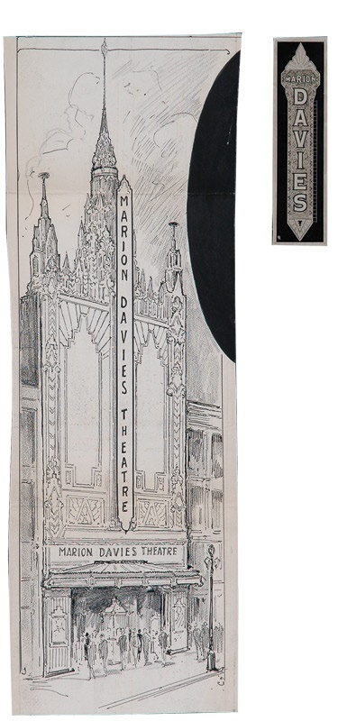 Where fantasy meets reality. In the film Citizen Kane, Charles Foster Kane builds a theater for the no talent opera singer Susan Alexander. Marion Davies was the real life mistress of William Randolph Hearst, who the film's characters were based on. Here he did actually plan a theater for her entitled, "The Marion Davies Theater". The only differences are this one never got built and Marion actually was a quite talented comedienne. Original pen and ink is 20x7' and is folded twice. Comes with small image of the theater's proposed billboard reading "Marion Davies" (6x1.5"). Just amazing, and the only place it would be was the archive of his Hearst's original newspaper, the S.F. Examiner. EX-MT.