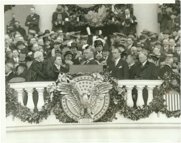 Classic image of Franklin Delano Roosevelt being sworn in at his Inauguration. A dejected Herbert Hoover is shown at right. International News stamp on the verso. Original paper caption. EX-MT. 8x10".